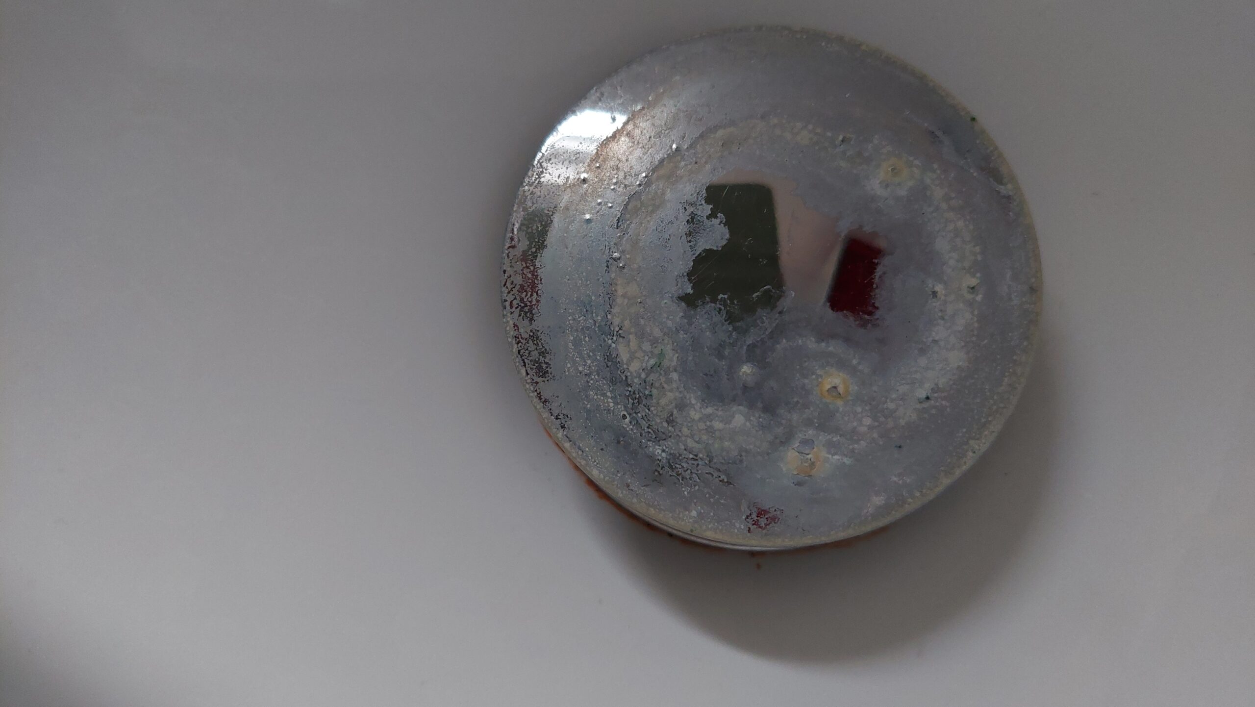 Chloorgas (CL2) is een sterk oxiderende stof. Dat betekend onder andere dat het bijvoorbeeld RVS kan laten roesten of chroom aantasten. Je krijgt dan zogenoemde put corrosie. Via ontvingen we deze foto van een wastafel die met chloor werd schoongemaakt: