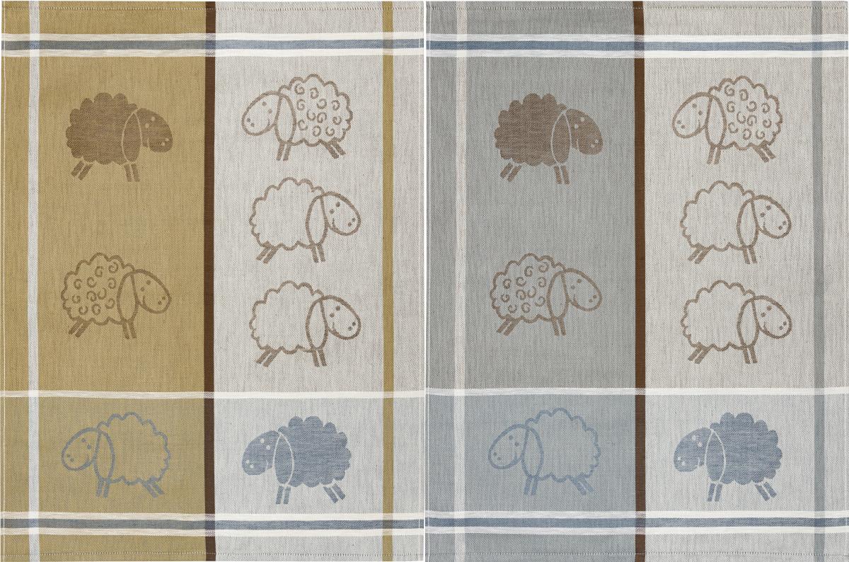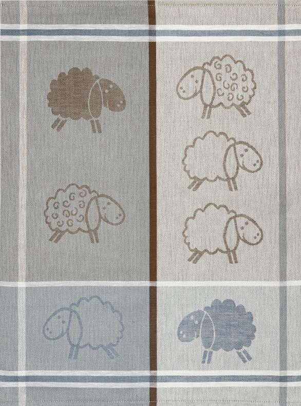 Deze grote theedoek heeft een afmeting van 50x70cm. De theedoek heeft verschillende kleuren met aan 1 zijde hoofdzakelijk grijs. Er bestaat ook een variant met een goud-bruine helft. De theedoek is jacquard geweven met een schaap patroon.